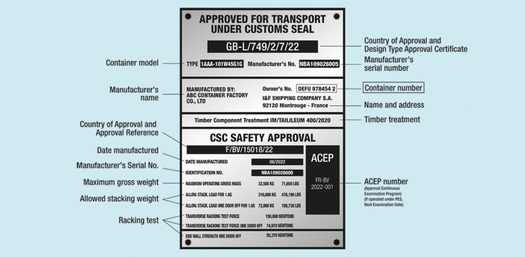 - The Customs plate (referring to the Customs Convention for Containers (CCC) requirements) showing the certificate applicable to the container to allow transport under customs seal.